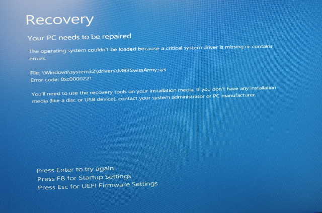 File:\Windows\system32\drivers\MB3SwissArmy.sysを調べてみるとMalwarebytes AntiMalwareのドライバだ。