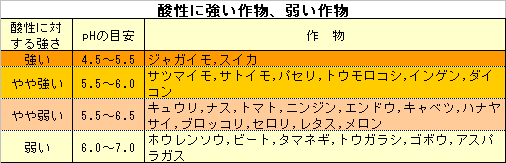 作物には酸性を好む、ないしは酸性でも充分育つ作物も多くあります。ジャガイモはpHが高くなると肌がザラザラになり、ダイコンやカブも肌が真っ白になりません。スイカやサツマイモ、トウモロコシなども酸性に比較的強いのでよほどpHが低くない限り石灰を施す必要はありません。