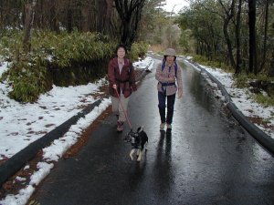 9時45分、登山口に到着。さっきまで降っていた雪はやんでおり、合流した3人と1匹は、少しほっとして歩き出す。