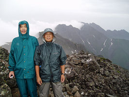 涸沢岳山頂も雨の中 |