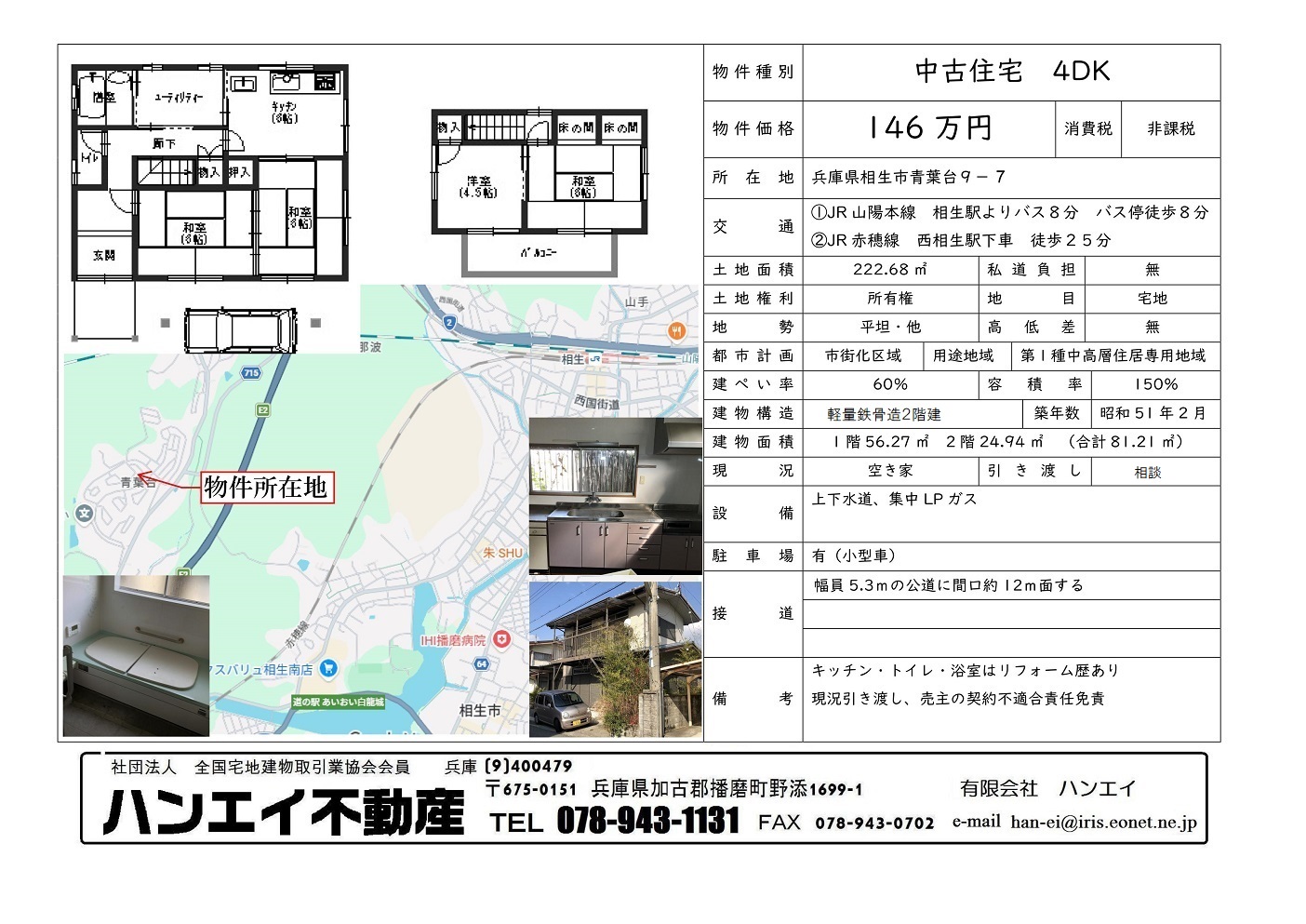 売り中古住宅 相生市 敷地67坪 現状渡し、リノベーション用物件 146万円 (中古住宅) (所在地)相生市青葉台3丁目 (交 通)JR赤穂線 西相生駅より徒歩約25分 詳細資料はこちらから⇒ |