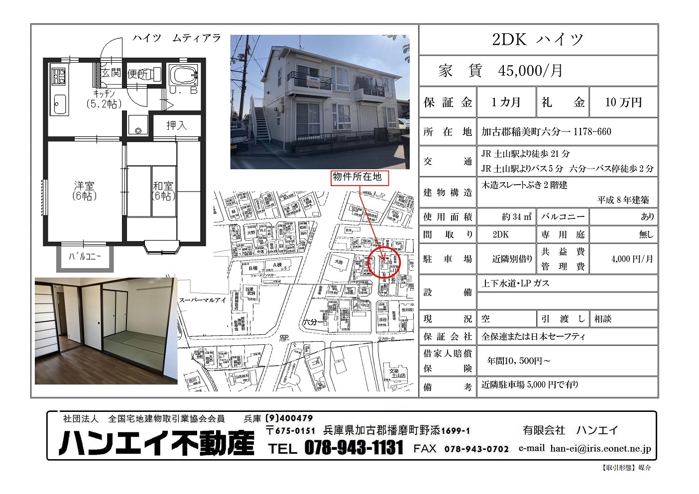 ハイツ 稲美町 1LDK 月額賃料 49,000円 (所在地)加古郡稲美町六分一相ノ山 (交 通)JR土山駅よりバス10分 バス停より徒歩約6分 詳細資料はこちらから⇒ |