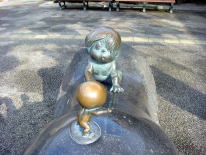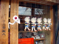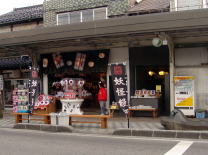 | 水木しげるロードの商店街・・・両方の道端に妖怪のブロンズ像が並んでいる | ||