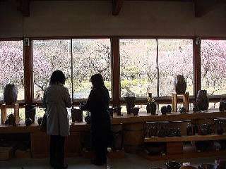 | 備前焼の並ぶ店内より | 枝垂れの紅梅 |