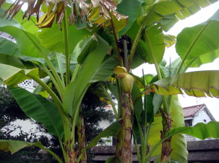 10月7日(水) 曇り 18号台風 芭蕉の葉は雨風に弱く破れやすいので、風流を好む松尾芭蕉が庭に 植えたことから、芭蕉庵と云われ、 それから取って俳号を芭蕉と名乗った。と本に書いてあった。 芭蕉の葉がボロボロになるよう台風は来て欲しくない。 早々と雨戸を閉めて外の音を遮断して、時々台風情報を見ながら一夜を明かした。 幸い風は強く吹かなかった。 それでも次の日ガレージの屋根がパオパオしていたので、 早速シルバーさんに来てもらって直してもらた。。 |