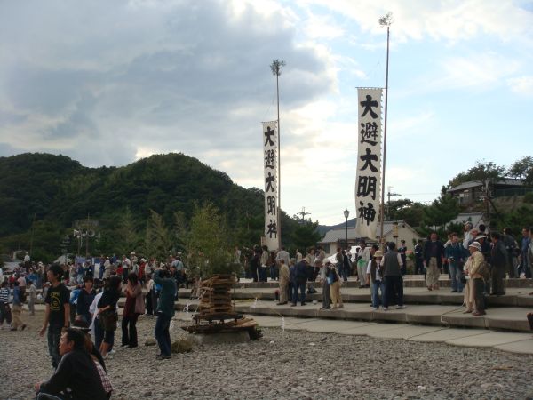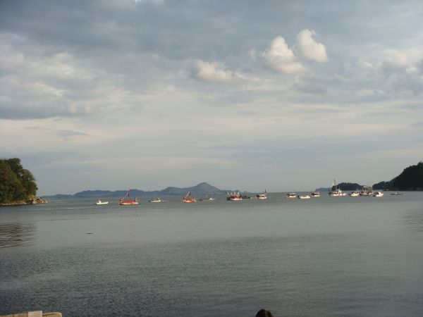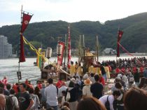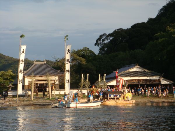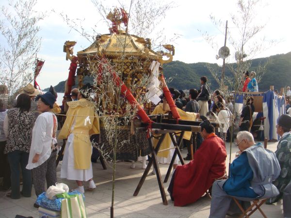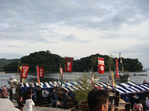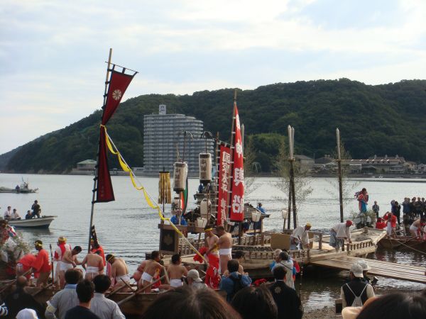 10月11日(日) 晴れ もう一つの祭り 坂越祭り 15時頃から坂越祭りを見に行く、文化財に指定されている祭り。 ちょうど練り終わって桟橋が掛けられた、 お御輿を船に乗せ生島の旅所に向かうところだった。 伝統ある祭りの中に、古から伝わる絵巻を見ているようで楽しい。 「18時からかがり火を焚いて、お御輿を迎えるので、幻想的ですよ」 と言われたけれど、そんなに長くは居られない。 夜の部は又来年にと思った。 本当に祭り好き |