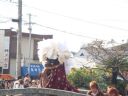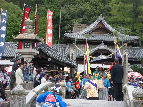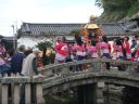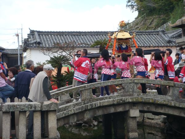 10月18日(日) 晴れ 尾崎祭り 倉敷の孫3人が来て近くの孫2人も来て賑やかに、尾崎祭りを見に行く。 以前ほどの人出ではなかった。 それでも祭りは心が浮き立つ、頭人の露払いは、練って練ってなかなか前に進まない やっと太鼓橋の真ん中に来たかと思うと又後へ下がる。これを何回も繰り返す。 頭人行列が通り過ぎると獅子舞の登場、花形の鼻高、元気な獅子舞 子共お御輿そしてきんきらきんの神様のお御輿が続く。盛大な祭りの山場である。 整列して神様の旅所(ノット)まで行列を作って行進する。其の賑やかな事 ところ所の特徴が有って面白い。 獅子舞は、単独に舞って夕方宮入りとなる。 子共等は祭りよりもお店が気になる様だ |