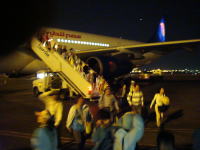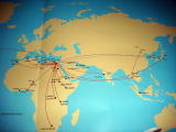 1日目(関西空港〜カイロ〜ルクソール) 6月1日 家から車で神戸埠頭へ 車を預けて 神戸埠頭から船に乗って関西空港へ エジプト港空機(ホルス)に乗り込む・・・ツワー団体18人 関 西 空 港 発14時45分〜〜カイロで乗り継ぎカイロ〜〜ルクソール着00:35 関西空港からカイロまで13時間又カイロで1時間待ちカイロからルクソールまで更に2時間 計15時間の飛行時間 日本とは、6時間の時差 6時間遅らせて時計を直す その間 機内食2回ケーキとお茶2回でした。飛行機は、あいにく窓の傍で無かったので、外の景色が見られない 雪を冠つた山脈が見えると、騒ぎ出したので、その時は席を変わってもらい外を見る ヒマラヤ山脈かな?とにかく感激 眠たり起きたり、解らないビデオを見たり日程表を見たりしたが、時間が経たない 早く降りたい! ルクソールのホテル(ナイルバレス)に着いた時は夜中・・・ 明日は7時30分集合・・・暑くなるので早くし出発するとか・・・かなり強行軍です |