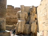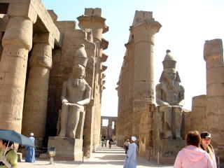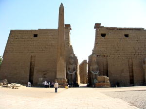 | ラムス2世の座像と25mものオベリスクがある 第一塔門・・・ルクソール神殿はここから始る |