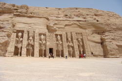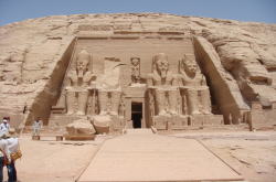 | ラムセス2世の4体の巨像のある大神殿 アスワンハイダムの建設で沈没の危機 移築しする 左から2体目の頭が足元に其のままに 至聖所には2月22日と10月22日に入 口から奥まで、日が差し込む神秘的な 作くりに成っている |