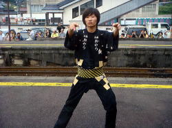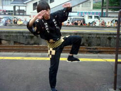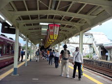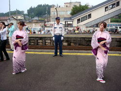 | 9月4日(火)いつの間にか日付も変わって。 午前4時ごら、まだ踊っています。それらを後にして、駅にと急ぎます。 空も白んで来ました。早いと思ったのに、すでに大勢の人が並んでいます。 知らなかったけれど、始発に乗ると見送りの踊りで送ってくれるそうです。 |