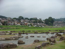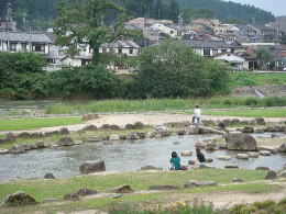 | 井田川に下りていって、長旅で疲れた足を浸しながら、持ってきた おにぎりを食べる。そして川向こうの八尾の町を眺める。 |