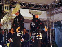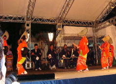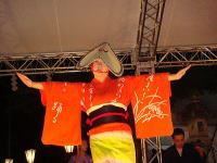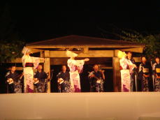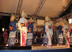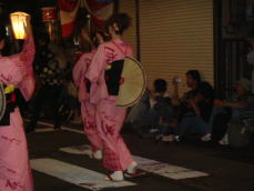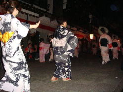 | 8時頃雨が降り出しました。そんなに大きな、雨ではありませんが 降ったり止んだりです。 中止に成るらしい、そんな声が聞こえてきました。 困まったな、予定が狂います。雨が上がってくれる事を願いました。 町を歩いて見ることにしました。 軒の有る、あちらこちらで踊っています。 家の中・お宮・お寺・会館・JA・他 町によってゆかた(衣装)も違うようです。 |