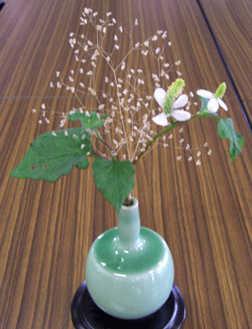 | 野草フラワーアレンジメント 作品1 シダ、ヒメジョオン、サツキ、キキョウソウ、 ヘラオオバコ、,ニワセキショウ、 マツバウンラン、カタバミ、オニタビラコ、 ハルノノゲシ、キュウリソウ等 2005.5.22 |
