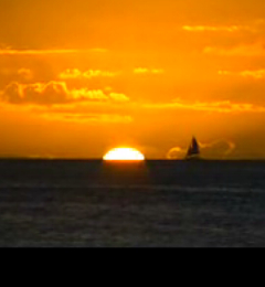 岩の上に遊ぶカップル二人の影、そして沖を行くヨット、その向こうに沈む大きな夕陽。オレンジ色に染まる空。エルビスのブルーハワイと共にご覧下さい。