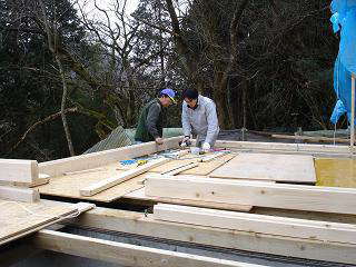 この日のログの組立作業は、「根太」の固定とログ一段目で終了です。