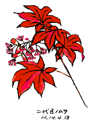 しかし、阪神大震災で家がひどく傷み、庭はメチャメチャにやられてしまった。「ノムラ」はかなりの深手を負ったので、家を再建する時、撤去されてしまった。今は2代目の「ノムラ」が、赤い花を咲かせている。2代目は、美しさや色ではとても先代には及ばない。でも、新芽を出すとき花を内包してくるのだ、葉っぱが開くとその間から小さい花がたくさんぶら下がって出てくるのだ。そこには、竹トンボのような種も付いている。しばらくの間、そんなかわいらしい姿を楽しませてくれる。
