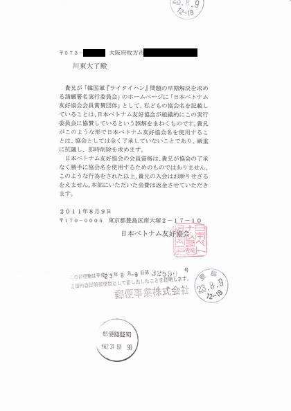 よって、この文書を受け取り、速やかに「日本ベトナム友好協会会員賞賛団体」の記述を削除しました。
