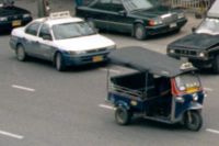 → バンコク大量輸送公社ホームページ ← タクシーに乗る バンコクのタクシーのほとんどがメーター制となったので以前のように料金交渉する必要はなくなりました。料金は初乗り2Kmまでが35バーツ、300m毎に2バーツの加算です。タクシーを利用する際はなるべく新しい車を見つけるようにしましょう。フロントガラスに赤丸のステッカーが貼ってあればメーターが検定済みなので安心できるらしいのですが、真偽の程は…。車種はカローラ、サニー、コロナが多いようです。停める際は手を水平に挙げて「おいでおいで」をする要領で。自動ドアではないのでドアは手で開けるようにね。運転手に行き先を告げてOKならば乗り込みましょう。料金交渉をすると藪蛇になるので避けるように。それといきなり金額を提示してくるタクシーも避けるようにしましょう。そうそうドアを手で閉めるのもお忘れ無く。空港からバンコクの中心部まで高速道路を利用したとしてもメーターを使えば200バーツ程度なのでご参考までに。 トゥクトゥクに乗る 一度は乗ってみたいと思うのがコレ。バンコクでは昔に比べて台数が極端に減りました。料金交渉制なので慣れない人にはとても面倒です。もう利用価値はあまりないように私は思います。なぜなら距離によってはメータータクシーの方が安い場合だって十分にあり得るからです。観光スポットやホテル周辺にたむろしているトゥクトゥクは概してボッタクリ料金を提示してきます。どうしても乗ってみたいという人向き。 チェンマイの蠢き方 バンコクに比べてチェンマイは公共交通機関があまり発達していません。市内バスも運行しているにはしているのですが旅行者にとってはほとんど使い物になりません。チェンマイの旧市街だけならば無理すれば歩いても廻れます(要体力+精神力)。しかし結局のところトゥクトゥクかソンテウ(小型トラックの荷台に屋根と簡単な座席を取り付けた乗合タクシー)のお世話になることとなります。ソンテウはとても安く利用できるのですが乗りこなすにはある程度タイ語を話せる必要があります。で、一番使いやすいのがトゥクトゥクとなってしまいます。バンコクに比べるとチェンマイのトゥクトゥクは極端にはボッてきません。しかも旅行者なら格安で利用できる特典もあったりするのでご紹介しましょう。多くのトゥクトゥクの運転手が郊外のサンカンペーンやボーサン方面の土産物屋と提携しており、そして客を連れて行くと紹介料がもらえるシステムになっているのです。土産物屋で気に入った品があれば購入すればよいですし、何も購入しなくても一向にかまわいません。コツは土産物屋に向かう前に観光したいところ(ただしワット・ドイ・ステープのように遠いところは無理)を廻ってもらいましょう。「土産物屋に行く」とOKしただけで運転手は喜んでリクエストに応えてくれるはずです。これらの土産物屋は一般観光客向けの工場兼直売所なので無理な押し付けや危険な目に遭うことはありません。なかには体育館くらいの広さの宝石店(無料ドリンク付き)もあり、数百万バーツの指輪なども展示されていて当然タダで見学できるのだなぁ。このあたりを計算に入れて観光するのもよいでしょう。 もしあなたがオートバイを運転できるのであればレンタルバイクをお奨めします。ホンダの100ccのオートバイを1日借りたとしても120B程度。コレさえあれば行動力は数倍にもなりえるでしょう。郊外へ行くのもへっちゃら。そうそうチェンマイの市街は一方通行が多いので気をつけるように!ちなみにガソリンは1リットルが15B程度。とても安い。国際免許を持って行くに越したことはない。(が、無くても滅多に捕まらない…私は責任を負えませんケド) 夜はピン川沿いのビアホールでタイの若者にまじりながらシンハーの生ビールを飲むのもオツなものです。 N E X T |