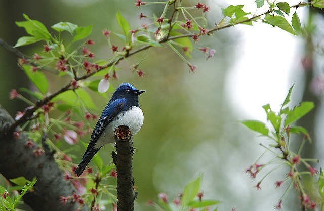 もうひとつ忘れられないのが、比叡山で見つけたオオルリである。万歩会の例会で北白川仕伏町から歩き、一本杉を目指した時だった。弁財天の鳥居を過ぎて新しい林道が開けた地点に到着した。北側の谷に杉林が広がっている。林道がかなり高い所にあるので、杉の木のてっぺんがかなり近くに見えている。その杉の梢の先端で鳴いていたのである。鳥の専門家がいなければ気がつかないことだった。双眼鏡ではっきり捕えることが出来た。こればかりは何人も代わる代わる見ているので確かな話である。その鳴き声もさることながら、濃い紺色のすばらしかったこと、まさに「生きていてよかった」といっても過言ではないだろう。