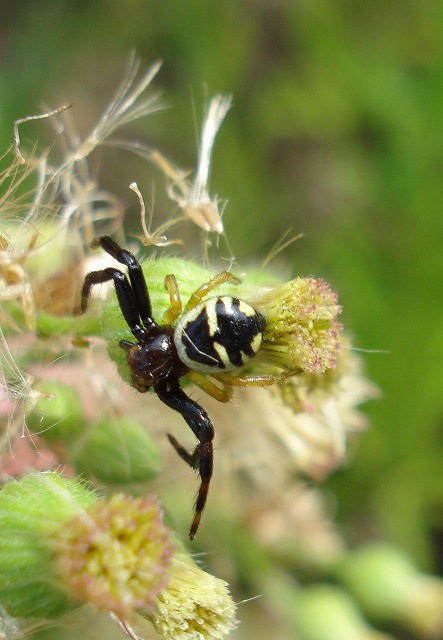 もう一つクモを。フノジグモというそうです。お腹の模様が漢字の「不」の字の形に見えるところから,名付けられたようです。クモといっても網を張らず,花の陰などに実を潜めて,飛んできた小昆虫を捕らえて食べます。比較的珍しいクモなのかも知れませんが,比叡平のある場所に行くと必ず見られました。比叡平はスゴイ!