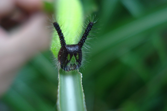 チョウや蛾の幼虫というのは,実に様々な色や形で楽しませてくれます。このイモムシも,まあ何と不思議な顔をしていることやら!まるでネコの顔に見えます(実際には顔ではなくて,模様なのだと思いますが…)。たぶん,クロコノマチョウというチョウの幼虫だと思います。
