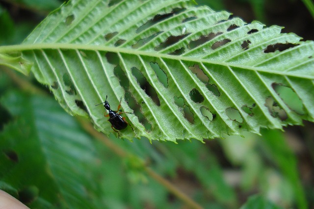木の葉の裏に,1pにも満たないような,小さな虫がいました。葉っぱにあいた穴は,この虫が食べた痕でしょうか?ヒメクロオトシブミだろうと思います。この虫,春には木の葉をくるくると巻いて,いわゆる「落とし文」を作ります。去年の春でしたか,その制作過程をじっくり観察したことがありました。この小さな体で,人間でいえば10畳くらい(以上?)の大きさの葉を,実に見事にくるくると巻いていきます。せいぜい,30分くらいでできあがりました。