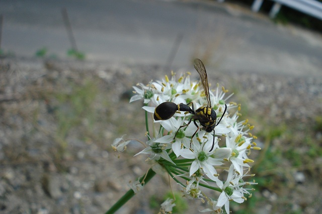 トックリバチの仲間でしょうか?この仲間の細い細い腰は,本当にこんなところを消化器官などが通っているのだろうか?とつくづく不思議に思います。幼虫の餌にするイモムシを,生きたまま動かないように麻酔をかける,その時にくねくね動くイモムシを確実にお尻の針で刺せるように,こんな腰に進化したのだそうですが…。泥で造るとっくりみたいな巣も実に見事なものだと思います。
