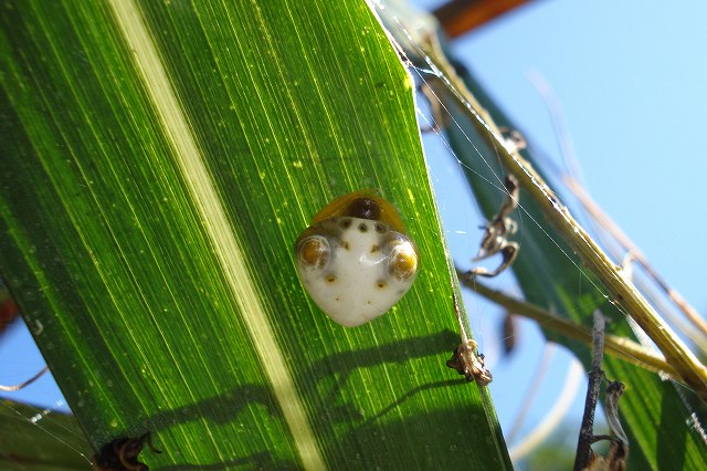 この写真,いったい何だとお思いですか?実はクモの一種,トリノフンダマシです。名前の通り,一見鳥の糞かと見まごう形をしています。しかし,これがのそのそと動き出すのです。上の方に見えている黄色い部分が脚。見つけたときはワクワクしました。本当に可愛い!
