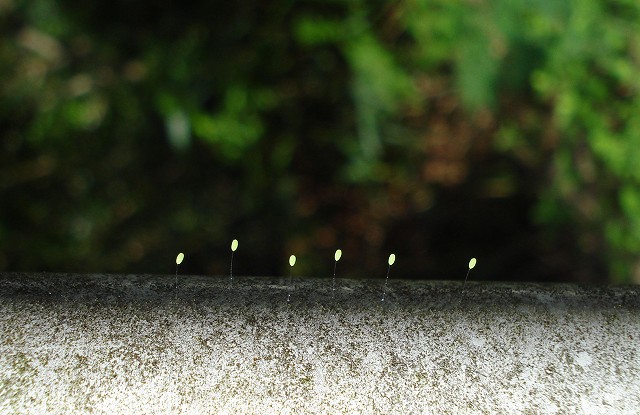 何かの落語で出てきたせりふ…だったかと思うのですが,「…ここで会ったが百年目,盲亀の浮木優曇華の花…」というのがありました。盲亀の浮木も優曇華の花もいずれも滅多に見られないもの,非常に稀少なものの例えとして使われているようです。ところがこの写真が「優曇華の花」,実はクサカゲロウという昆虫の卵なのだそうですね。せいぜい1pくらいの長さの先に豆粒のような卵が付いています。