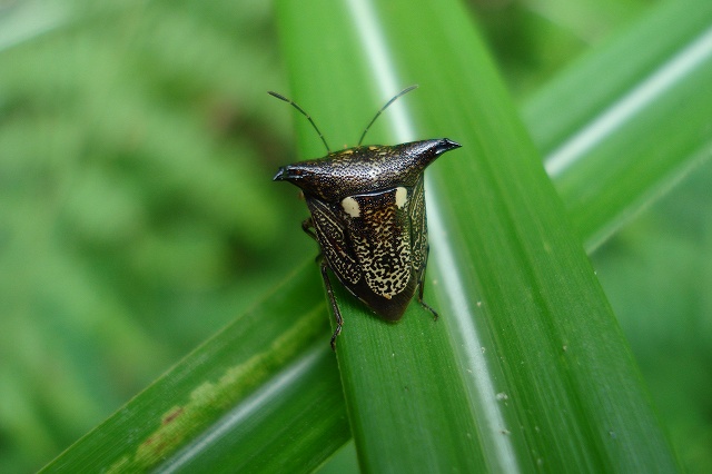初めて見たときの印象は,何かのアニメで見たロボットの顔…。よくよく見ると,まるで高級な皮革細工のような趣もあります。カメムシの仲間で,ウシカメムシだそうです。なぜ牛カメムシなんだ,と思ったのですが,確かに見る角度によっては,尖った肩の部分がまるで水牛などの角のように見えて,ウシカメムシという名前にはナットクさせられました。