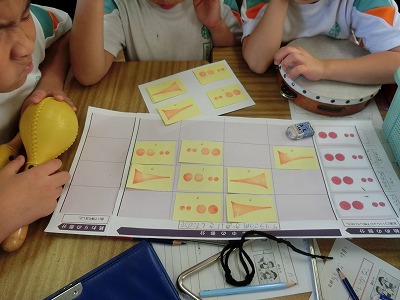 各班3人ずつのグループを組み、リズムアンサンブルの活動を行っていました。