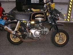 おまけ! 愛車ゴリラ。18歳からのおつきあい! エンジン:88ccにボアUP カム:ストリートハイカムにしてます。 キャブ:フラットキャブ24パイ マフラ:ダウンマフラー ショック:リアのみ交換 タイヤ:プロファイヤーだったと思う。 その他はドノーマル。 こどものぴかちゅー号(後ろ)とほぼ同じ大きさだった。 キャブの燃調が難しかったです。 でもその結果3桁のスピードが出ます。怖いぞ〜! |