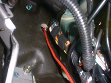 車内に電源を取り込んだ様子です。 穴の向こうはまさにエンジンルームから引き込んだゴムがいます。 無線機側にヒューズが付いていなかったら、必ず電流に見合った値のヒューズを入れてください。 よく、間にリレーを入れる方がいますが、リレー自身がかなり熱を持つと思います(経験者)。 電源の切り忘れ対策は無線機側に任せて、出来るだけ直接電源を取りましょう。 |
