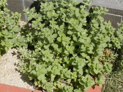 ![]() 区画からはみ出そうに繁殖しているオレガノ 一枝から1年でこのくらい大きな株になる |