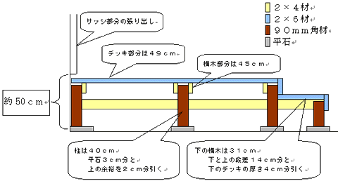 柱には横木を左右2本、木ねじで止めていきます。木ねじは70mmのものを使いました。上のデッキと下のデッキ(ステップ部)の高さの差は2×6材の巾140mmです。 ですので、下の横木の高さは、(上のデッキ高さ)から (上下のデッキの高さの差)と(下のステップの2×6材の厚み)を引く、 =49cm−14cm−4cm で31cmとしました。 と、このように高さは決まれば、あとは組んでいくだけ! 水平尺で水平になるようにだけ気を付け、どんどん組んでいきます。 これでほぼ「基礎部分の設計図」通りに組み上がりました。(下の写真でーす) <失敗談> 水平ばかりにとらわれ、角の直角がうまくなっていないとデッキの板を乗せていくときに隙間が出来る。 まぁーそれも手作りの味!? 気にしないでOKだが、気になる人はそこのところも気を付けましょう。 私は気にしませんでした(^^ゞ |