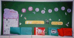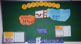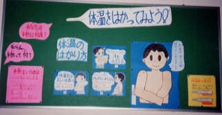 | 体温をはかってみよう かぜの流行に合わせて掲示しました。 右の人形の腕を動かして、上手に体温を測ってみよう。 |