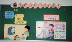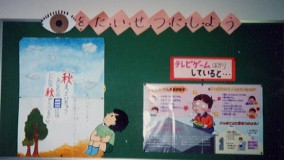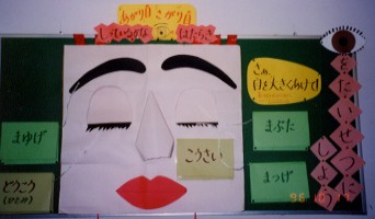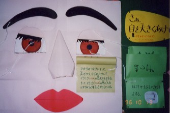 掲示板を全面使った顔。ひっぱれば、目が開いて
