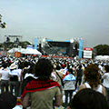 | 久々更新。元気にしてます。 ユカリエンヌにMTWBに連れてってもらいました。2004年初フェスです。 もう、お互いいい年ということで体を気遣いながら参加。 ライブ始まってみないと分からないタイムテーブルが 超私たち好みで、ヒトトヨウ見ずして夕方には帰れるという非常に有意義なライブでした。 アジカン→音ちっちゃかった?客の盛り上がりなさにとまどいつつ、へぼかっこよいかったです。 エゴラッピン→ヨシエちゃんの声すげーパワフル。客引きまくりでおもろかった。 ユキちゃん→楽しみにしてたけど、ヨシエちゃんとりんごさんの間に挟まれて印象薄い。 東京事変→一番かっこよかった!りんごさん歌うますぎ。衣装も動きもかわいい。音もおしゃれで高級チック。 リップスライム→スペシャルゲスト!楽園ベイベー!ラッキーでした。テンション上がりました。満足して帰宅。 全景 テロリスト 隠し撮り!*ゴロリ転がってみる稲妻は感動しました。 *ミーハーして、アジカンのリストバンドを購入してしまいました。今年1回はつけるぞ! *すげーCDももらえたし、パインうまかったし。 *帽子の下にタオル挟むの快適。 *暑かったり他の客の文句など言ったものの、非常にたのしい2004年フェスの幕開けでした。 *音楽のあう友達といくフェスはたのしいし楽だね、ユカリエンヌ。 実はその後、急遽焼き鳥デート。私臭いまま。 また髪ぱつんぱつんに切ってました。似合ってない具合が非常によろしい。 |