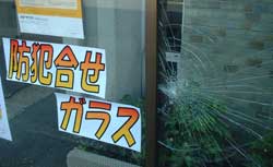 セキュレの割れ方 実際にバールで割ってみました。 割れはしますが、穴は開いておりません。 これはガラスにはさまれた中間膜が、ガラスを 保持しているためです。 防犯ガラスによるメリット ●侵入盗によるガラスの打ち破りに有効 ●破損しても脱落がないので 家庭内の不慮の事故でも 被害は最小限に押さえられる ●台風地震により破損しても 飛散脱落を抑えます。 ●紫外線を99%カットするので 家具 内装等のやけを 防ぐことができる。 ●赤外線を カットできるので 冷房効率が上る (ただしセキュレク ールベールを使用した場合) |