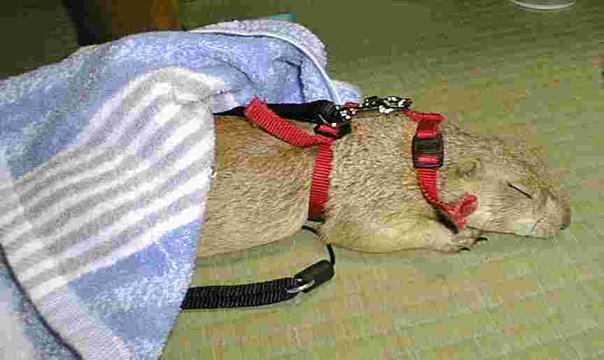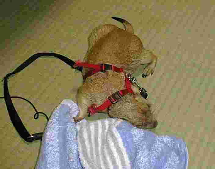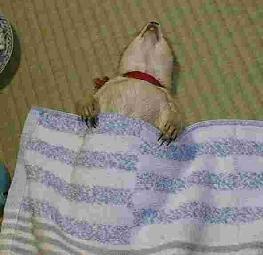 タオルのお布団を掛けてもらって爆睡のゴン太。 すやすやすやすや・・・・・ まだまだ眠い・・・ お散歩で疲れたのかしら? そう言えば、今日はお昼寝もできなかったもんね。 もう駄目だぁ〜・・・ 何があっても起きないぞぉ〜 矢でも鉄砲でも持ってこ〜い・・・グーグーグー・・・ だって眠いんだもん・・・ もうちょっと寝かしてぇ〜。 後5分・・・