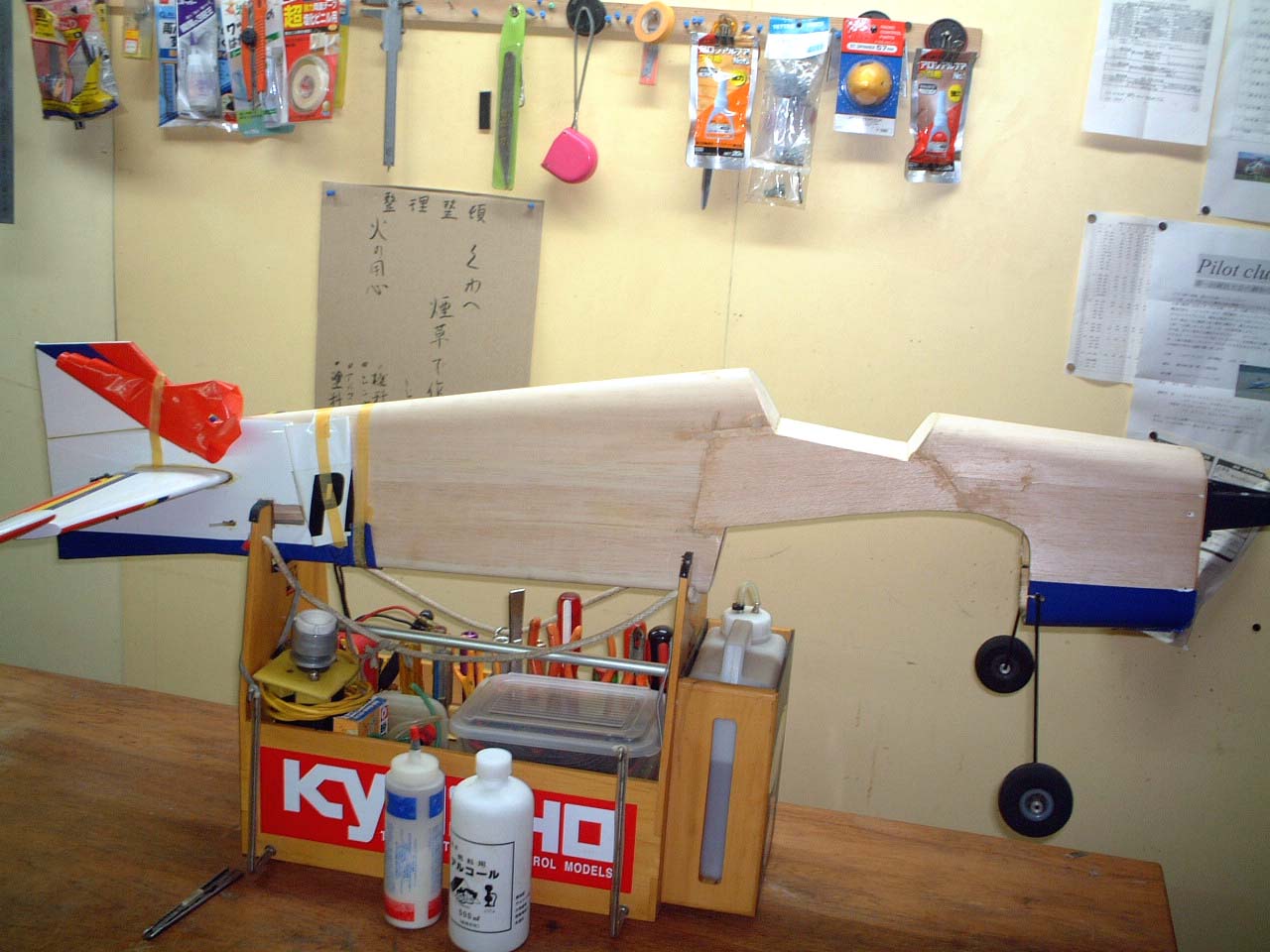 のメンバーの方が所有していたプライマスファンがクラッシュし、胴体は真っ二つ、主翼はリブからぼろぼろという状態になり、その機体が6月にパイロットクラブに搬送されてきました。この機体をパイロットクラブのブラックジャック・山本さんが修復し、見事復活しました。写真の方が木工の達人・山本さんです。