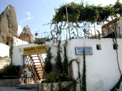 朝5時30分、まだ辺りは真っ暗だがカッパドキア観光の中心地であるギョレメに到着。すぐ近くのインフォメーションで宿探しに入る。 何十枚もの宿紹介パネルがあってそこから自分で選ぶシステムで、先に来ていた韓国人女性3人グループが宿を決めて出発するのを待って、自分はパラダイス・ペンションに。日本語で「歓迎」とか「ようこそ」とか書いてあるパネルもあったのだが、あえて英語表記のみの宿にしてみた。 インフォメーションの店番が電話をかけてくれる。こちらの希望を伝えるときのみ替わってもらって、シングルで2泊という条件(という程のものでもないが)を出す。 電話を切って10分ほどするとすぐに迎えのピックアップがやってきた。 ぼくの顔を見たとき一瞬「ん?」という表情を見せたが、質問は「じゃぽね?」だけだった。