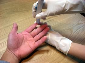 血液採血といって、腕まくりをされて「さぁ、とってくれ!」と目をつむる方がおられますが、実際の採血は指先にちょっと針をさすだけなの簡単な検査です。