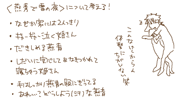 秀麗のそばでは熟睡できるとかいう設定はどうよ…とかいう話もしてました。