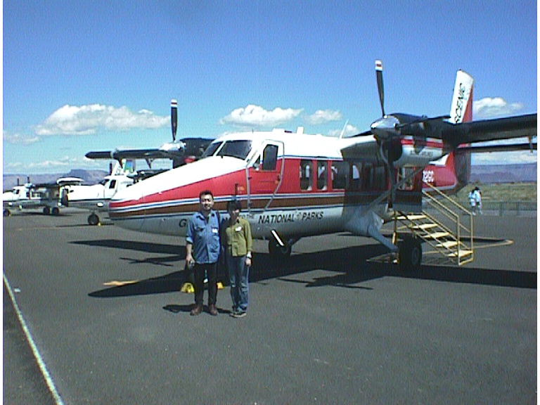 その後、各ホテルから集まったマニアックな日本人旅行者たちも加わって合計8名に。そして最後に英国からの団体旅行者15人が合流して約25人乗りのプロペラ機に搭乗。グランドキャニオン国立公園までの約1時間の飛行。ガタガタと激しく縦揺れする機体と時折入ってくる強烈なガソリン臭(コレはちょっと怖かったゾ!)が家内には堪えたようで到着した時にはもう飛行機酔い(むしろニオイ酔