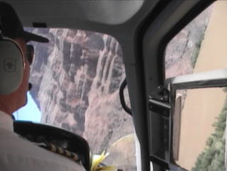 い)でヘロヘロになっていました。それでも最悪の事態“リバース”をせずに済んだのはひとえに、その日の朝食がホテルの売店で買ったピスタチオとエビアンだけだったからに違いありません(笑)。その後すぐバスに乗り継ぎ、ネイティヴ・アメリカン料理を食べさせてくれる大きなテントのある施設まで30分ほど走ってブランチ。メニューは煮豆、蒸したポテト、ゆでたコーン、ローストチキン等々…。見た目はコッテリしているのですが味は意外にもサッパリしていて食べやすかったです。そして1時間弱の休憩の後にまたバスに乗り、再び飛行場へ。いよいよメインイベントであるヘリコプター遊覧です!6人乗りのスタイリッシュなヘリに4人ずつ搭乗した僕達は、離陸直後いきなり谷底に向けてまっ逆さまに急降下!その後もグランドキャニオン観賞ビデオに出てきそうな絶景の場所をグイングインと滑空。いやもう最高の気分でした。約5分の飛行で谷底の休憩所に到着しましたが終始ギャーギャー叫んでいたので今度は家内も酔う暇すら無かったようで