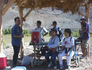 す。コロラド川の支流を流れる水の音しか聞こえない谷底の岩だらけの河原で現地の人が用意してくれたペプシを飲みながらしばし歓談。ここで仲良くなったのが名古屋から来た男性2人組。コンピュータエンジニアをしていて今回が初めての海外旅行とのこと。とはいうものの旅程のほとんどをラスベガスとグランドキャニオンに費やしており、前日にもブラックキャニオンの川下りに参加したという好き者…もとい、強者。結局、同行した8人みんな似たり寄ったりの嗜好性、価値観を持っていた為にすっかり仲良くなって互いに住所を教えあったり記念撮影したりしました。全行程を終えてホテルに着いたのが午後3時。グランドキャニオンでは元気復活していた家内でしたが帰りのセスナ機で再び酔い倒してしまい完全にグロッキー。明日のロスに向けての出発時刻が朝5時(信じられない…)という事もあり、結局MGMグランドアドベンチャーもニューヨーク・ニューヨークもミラージュの火山噴火もルクソールのピラミッドも見に行くことなく、ラスベガス最後の夜はおとなしく眠りにつきました(泣)。