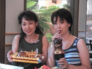 こでナント!2日前にラスベガスで別れた女の子2人組と奇跡の再会!!「ジュラシックパーク」の滝に打たれてビショ濡れになった髪や衣服を日光で乾かしながらベンチでポップコーンを頬張っていた時のこと、前方約50mの所で、やはりビショ濡れになった彼女たち2人が互いに写真を撮りっこしているところを家内が発見。なんという奇遇。500kmごしの再会を祝って一緒に昼食をとりました。話の流れで自然に分かったのが彼女たちの職業でした。なんと看護婦さん!!やはり…。どおりでハキハキしていると思った。