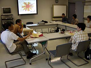 国際理解研究会(林良昭会長)より 1.ファシリテーター林氏より、京都での実践について報告 2.「自分たちが『世界がもし100人の村だったら』ワークショップを実践するとしたら」の話し合い 3.自由討議